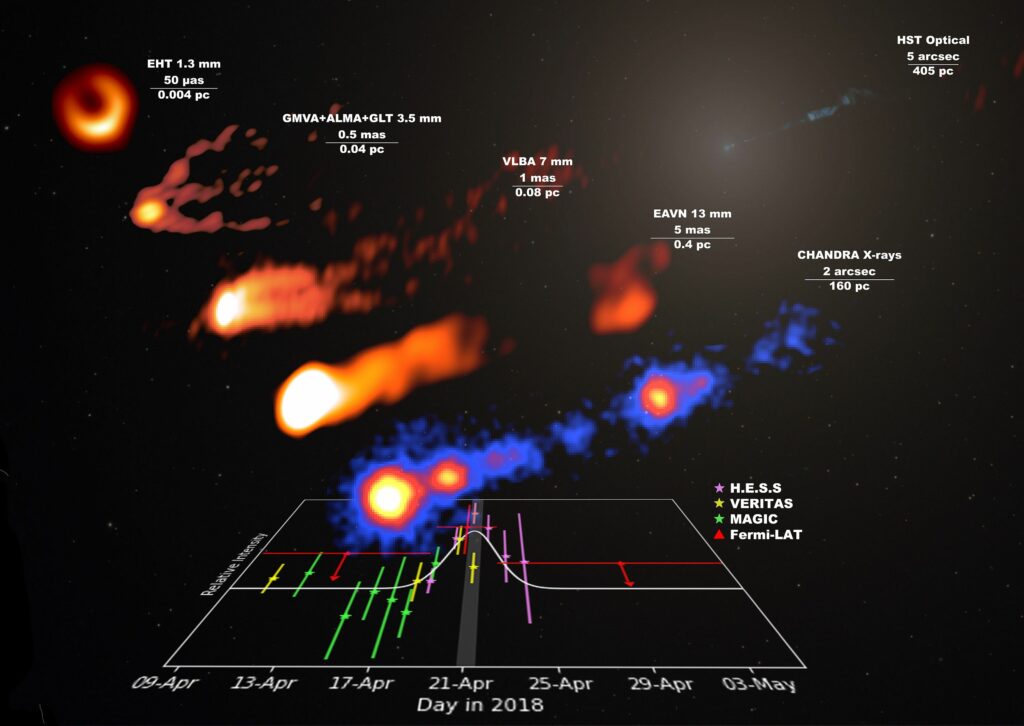 Międzynarodowa współpraca EHT ujawniła nowe obserwacje rozbłysku gamma z potężnego strumienia emitowanego z centrum galaktyki M87 na wielu długościach fal.