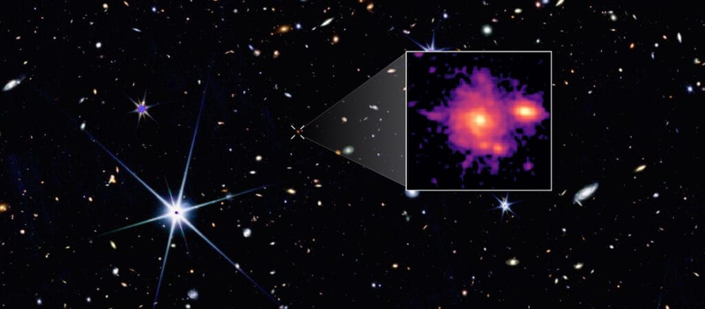Astronomowie dostrzegli parę galaktyk w trakcie łączenia się 12,8 miliarda lat temu. Charakterystyka tych galaktyk wskazuje, że połączenie utworzy jeden