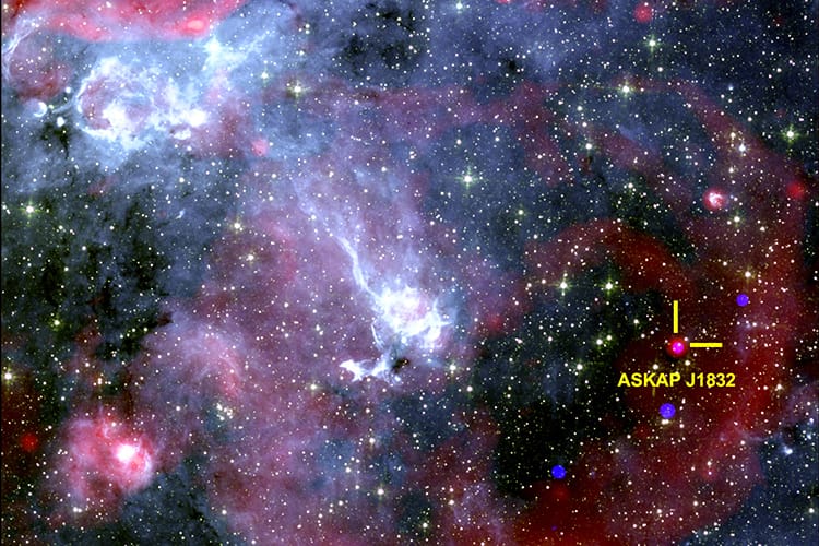 Astronomowie dokonali zaskakującego odkrycia nowego typu kosmicznego zjawiska. Zdjęcie nieba ukazujące region wokół ASKAP J1832-0911, tajemniczego nowo odkrytego obiektu.