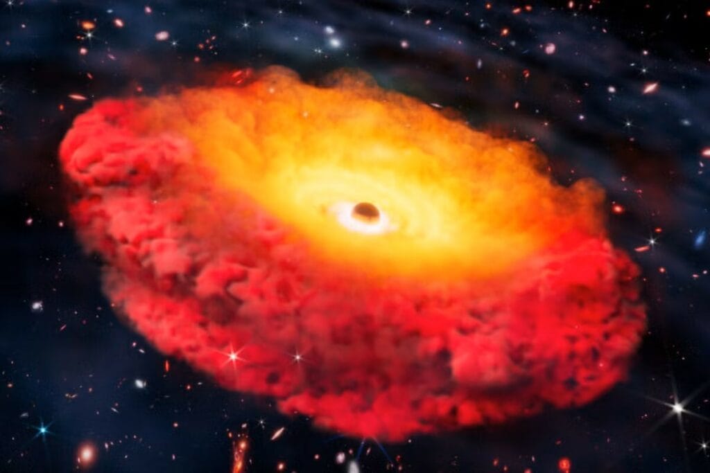 Międzynarodowy zespół astronomów zidentyfikował najodleglejszą czarną dziurę, jaką kiedykolwiek potwierdzono. Wizja artystyczna galaktyki CAPERS-LRD-z9, w której znajduje się najwcześniejsza