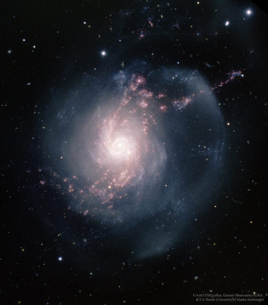 Dzisiejszy obraz z Gemini North, pokazujący różowe pasma gazu i błękitne gromady, pięknie potwierdza tę historię burzliwej przeszłości galaktyki.